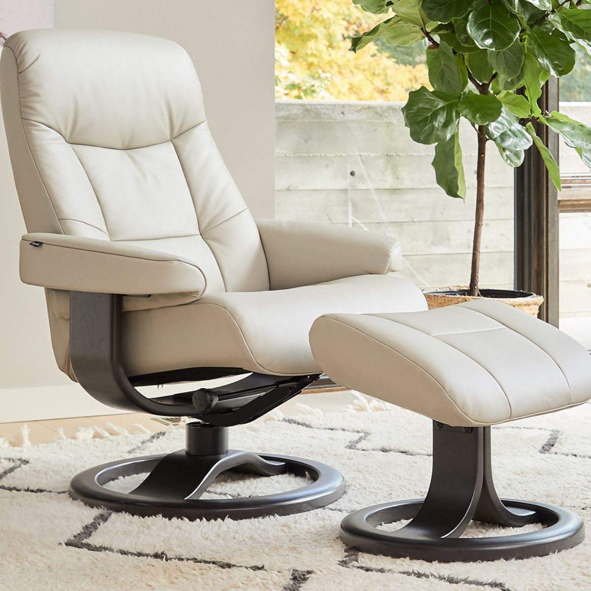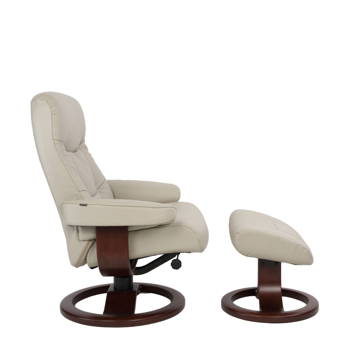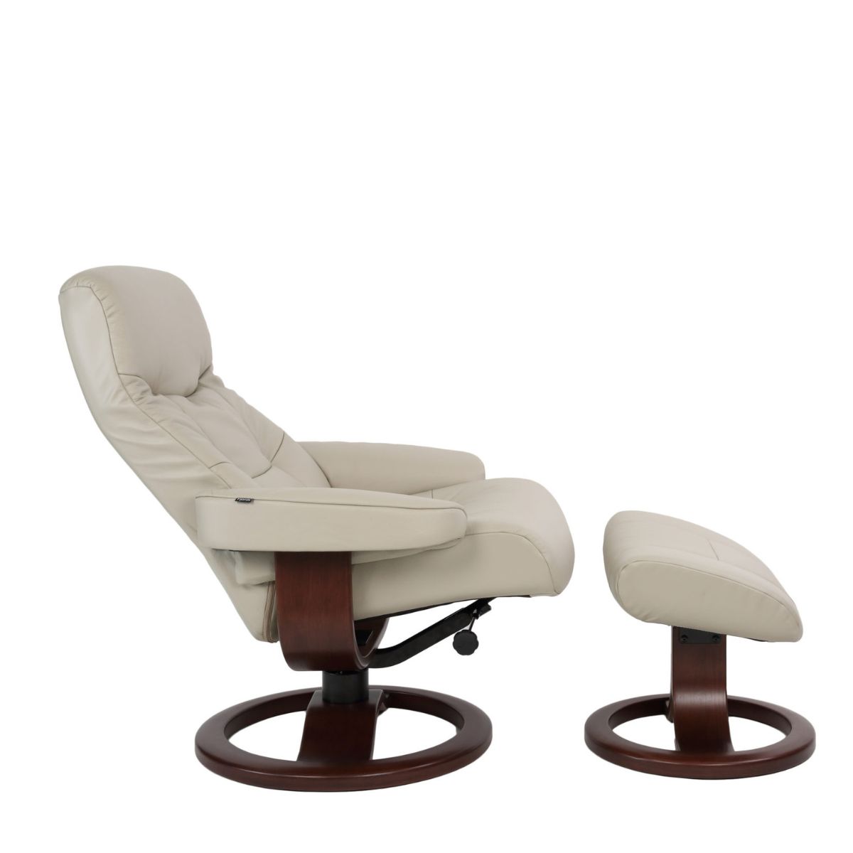 The Fjords Muldal chair with variable adjustment provides continuous support and by means of our Fjords® Active Release System™ the neck angle is automatically adjusted while you recline, with bases which have a 360° swivel. The base is produced in laminated, stained wood which gives it an elegant character. Available in all our leathers and select fabrics. The chair is available in two sizes, small and large.
