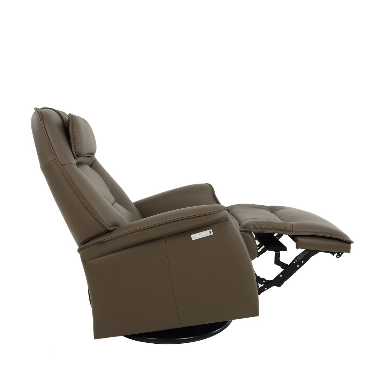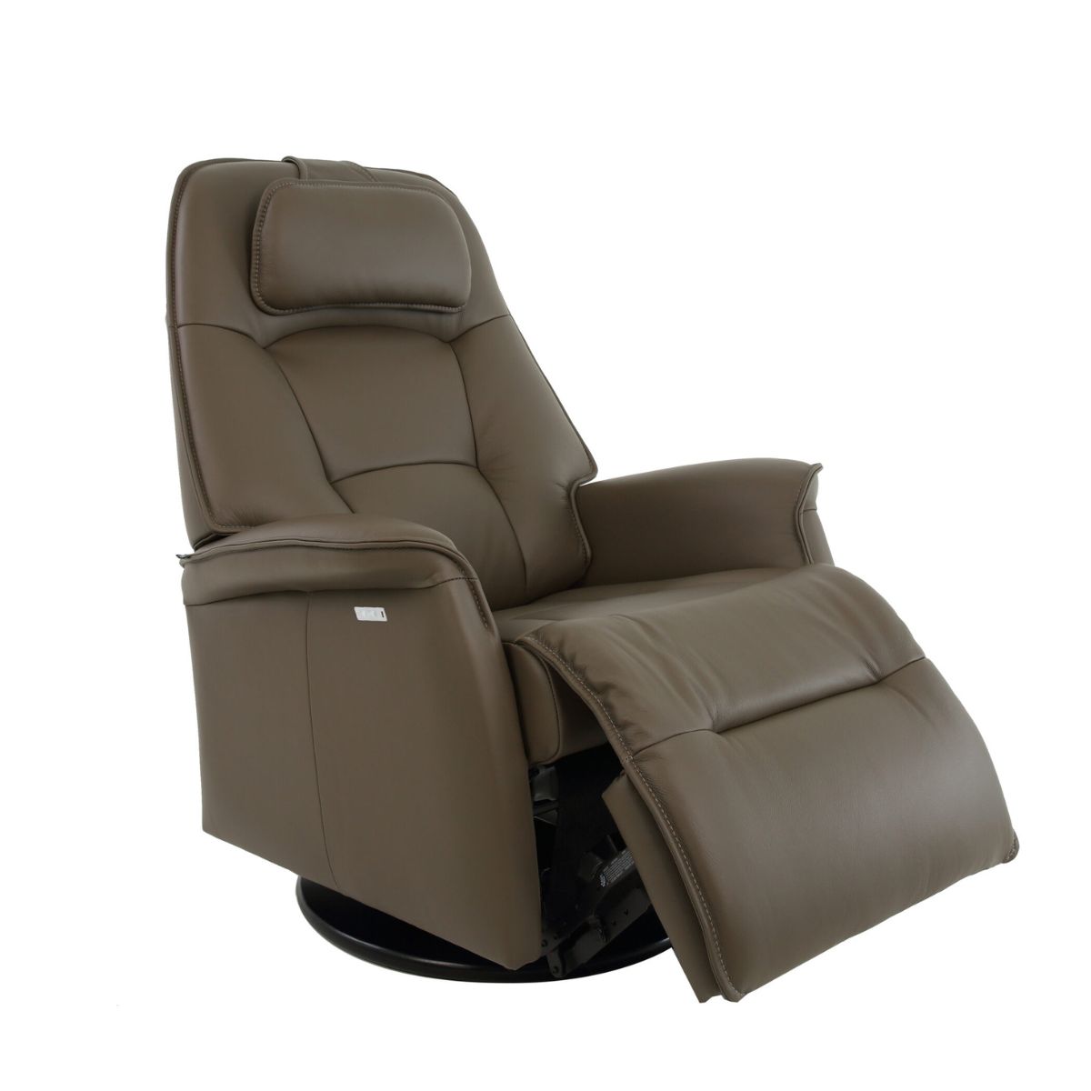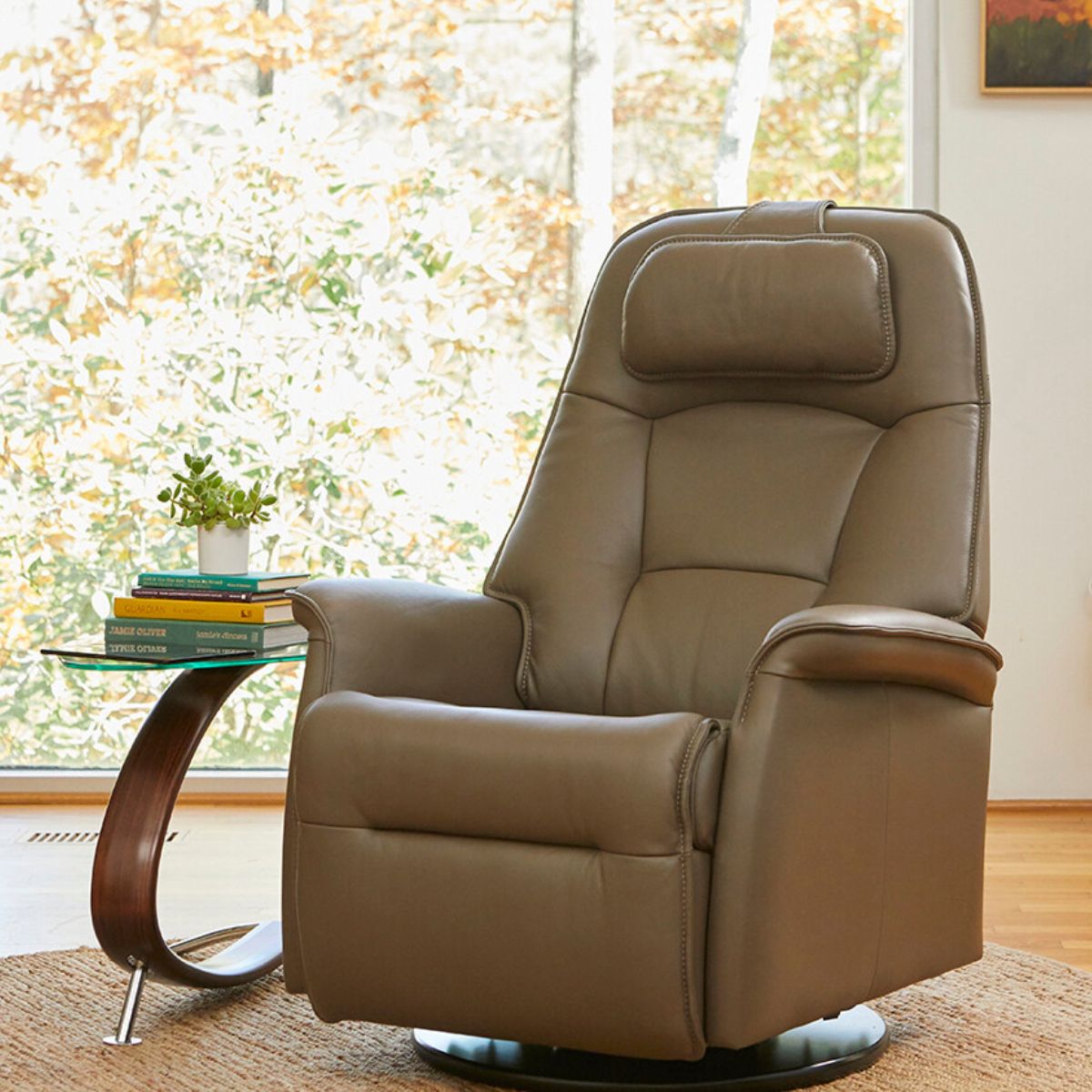 The Fjords Stockholm swing relaxer, featuring an adjustable head pillow and motorized articulating headrest, makes the seating experience ergonomic and gives your lower back correct support. Available in all our leathers and select fabrics, the Stockholm is a swivel/glider/rocker recliner available in motorized and manual versions. Available in all our leathers and select fabrics, Stockholm is available in two sizes, small and large. Black base is standard on Stockholm.
