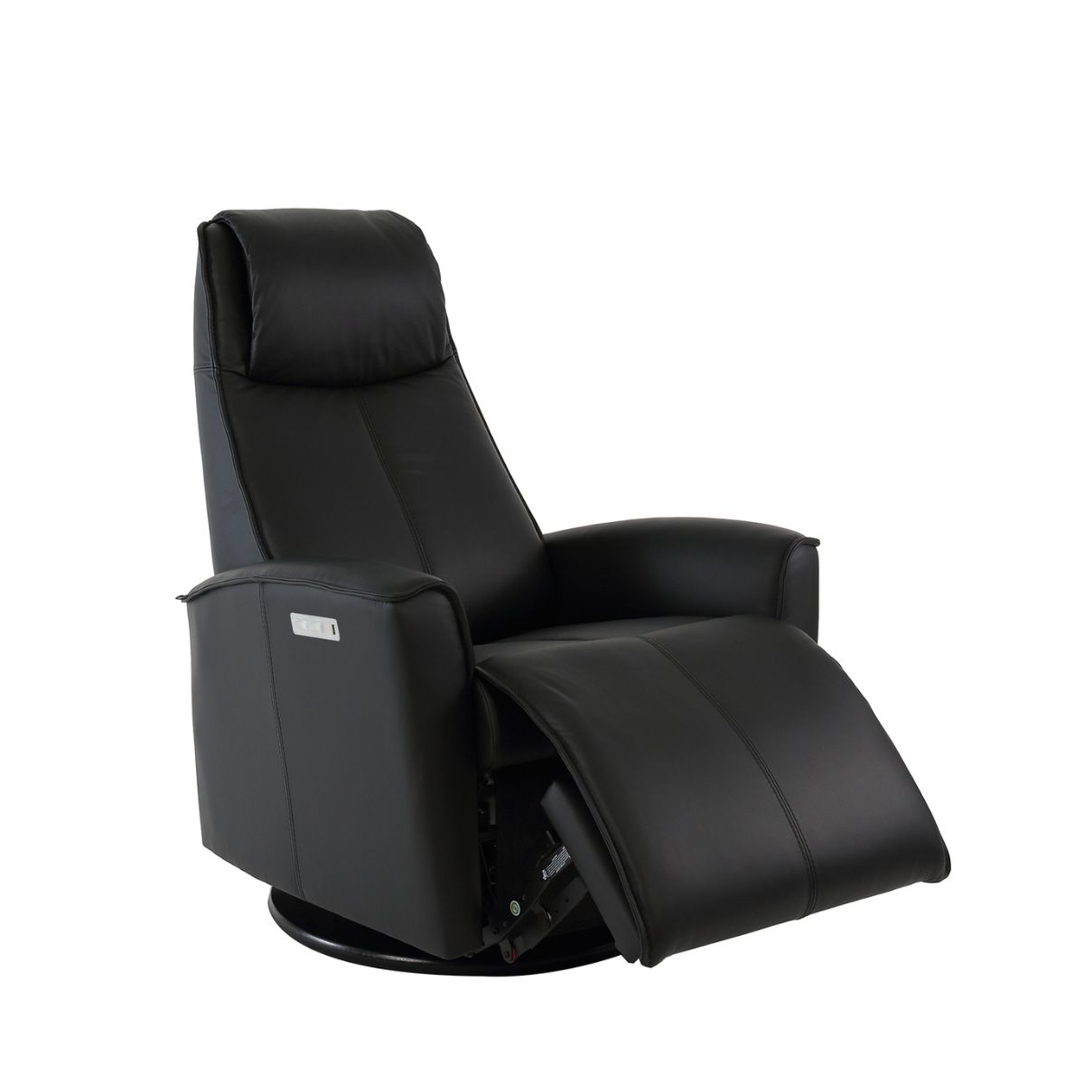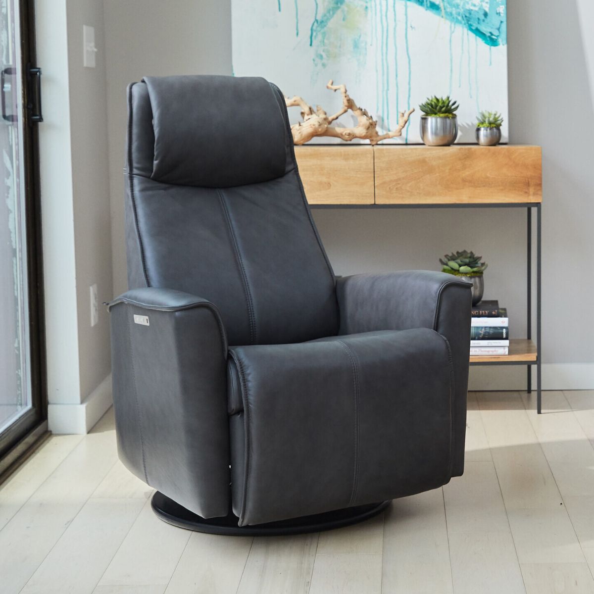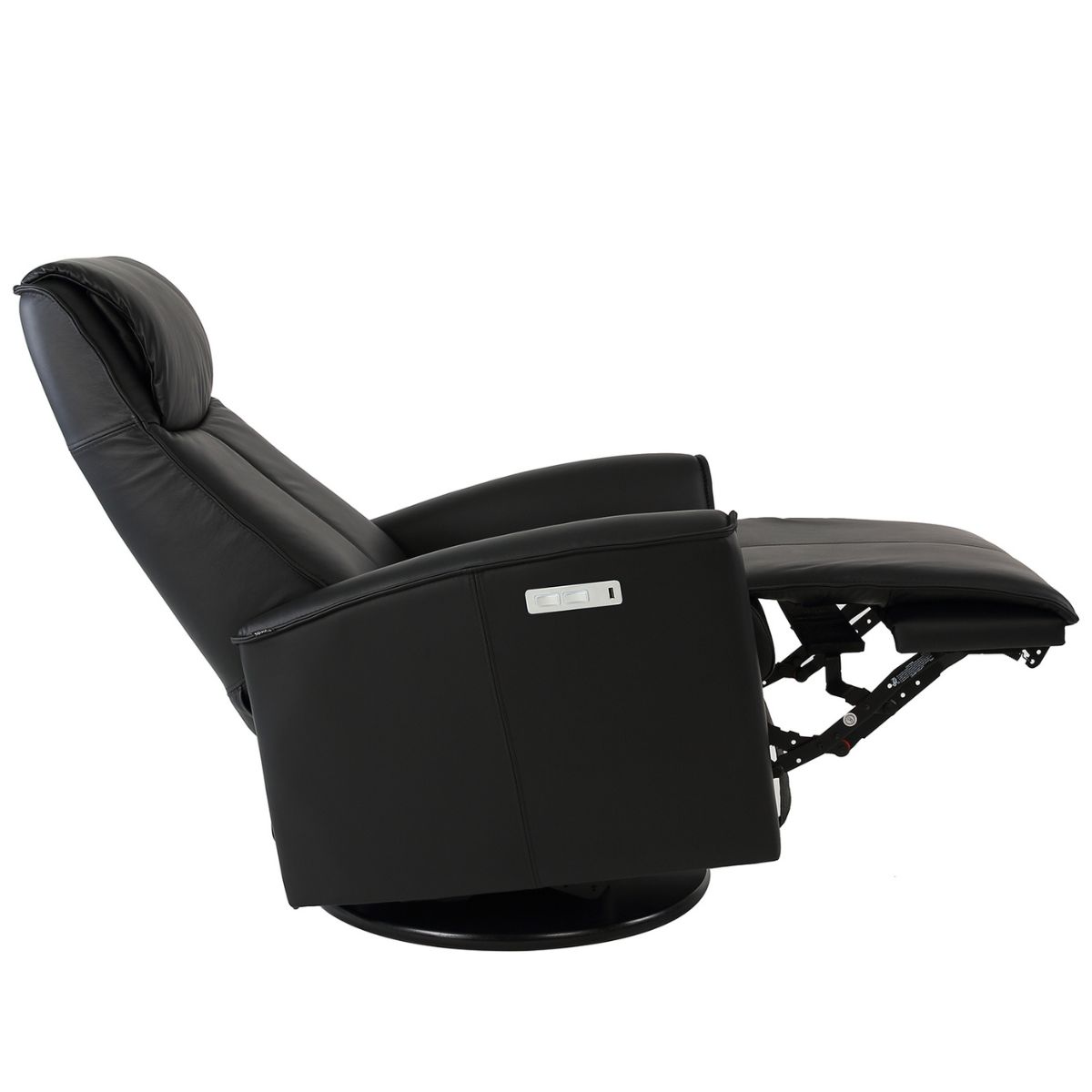 The Fjords Urban swing relaxer, featuring a motorized articulating headrest, makes the seating experience ergonomic and gives your lower back correct support. Available in all our leathers and select fabrics, the Urban is a swivel/glider/rocker recliner available in motorized and manual versions. Available in all our leathers and select fabrics, Urban is available in two sizes, small and large. Black base is standard on Urban.